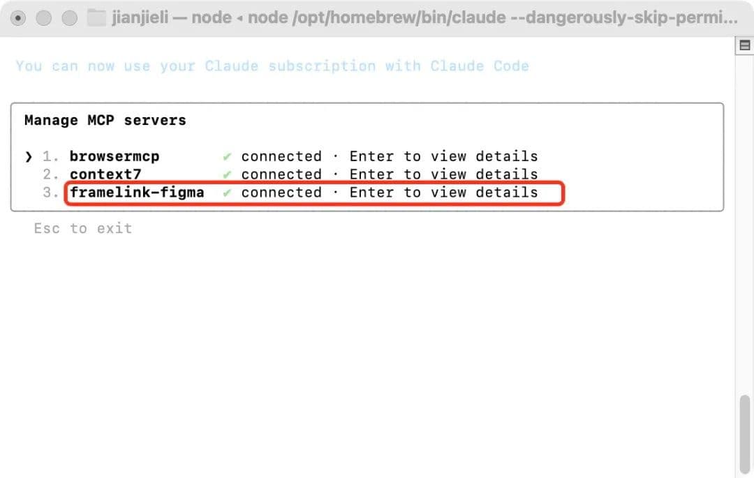 打开Claude code,输入/mcp 并回车,看到 figma-connection 出现在列表中,就说明大功告成了!